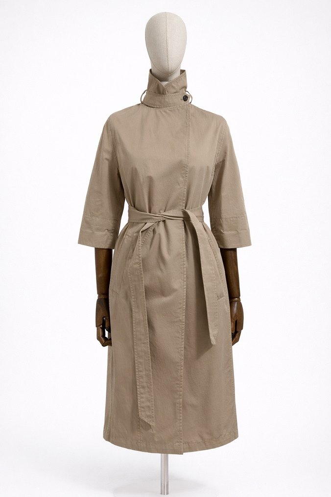 Bej renkli, uzun keten trençkot yüksek yakalı ve askılı kolludur. Kemerli ve normal kesim olup, ofis kullanımı için uygundur.