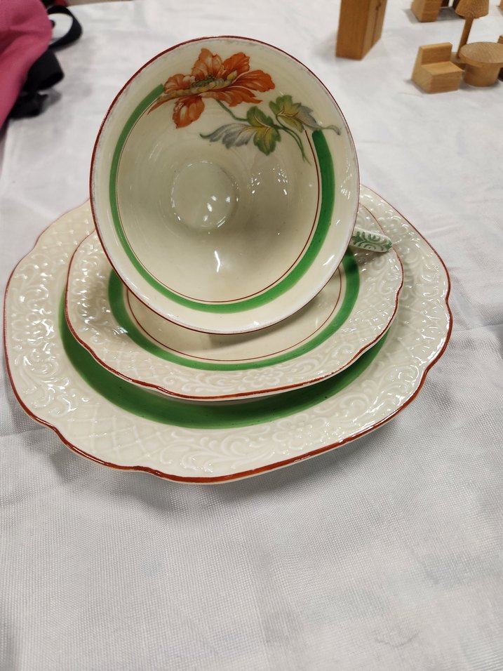 Yeşil ve turuncu detaylı çiçek desenli beyaz porselen fincan ve iki tabak seti, zarif kabartmalı desenlere sahiptir. ☕