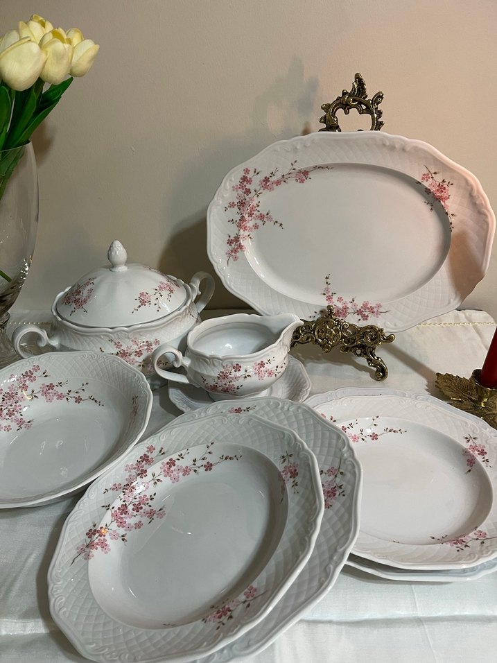 Pembe çiçek desenli beyaz porselen yemek takımı. Tabak, kase, kapaklı servis kabı ve sosluk içerir. Şık detaylara sahiptir. İade ve değişim toktur