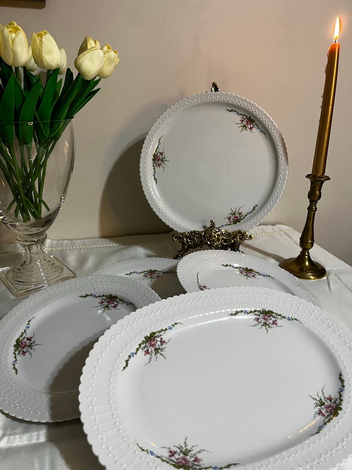 Beyaz porselen tabak seti, zarif çiçek desenleri ve dokulu kenarlarla yemek servisi için uygundur.