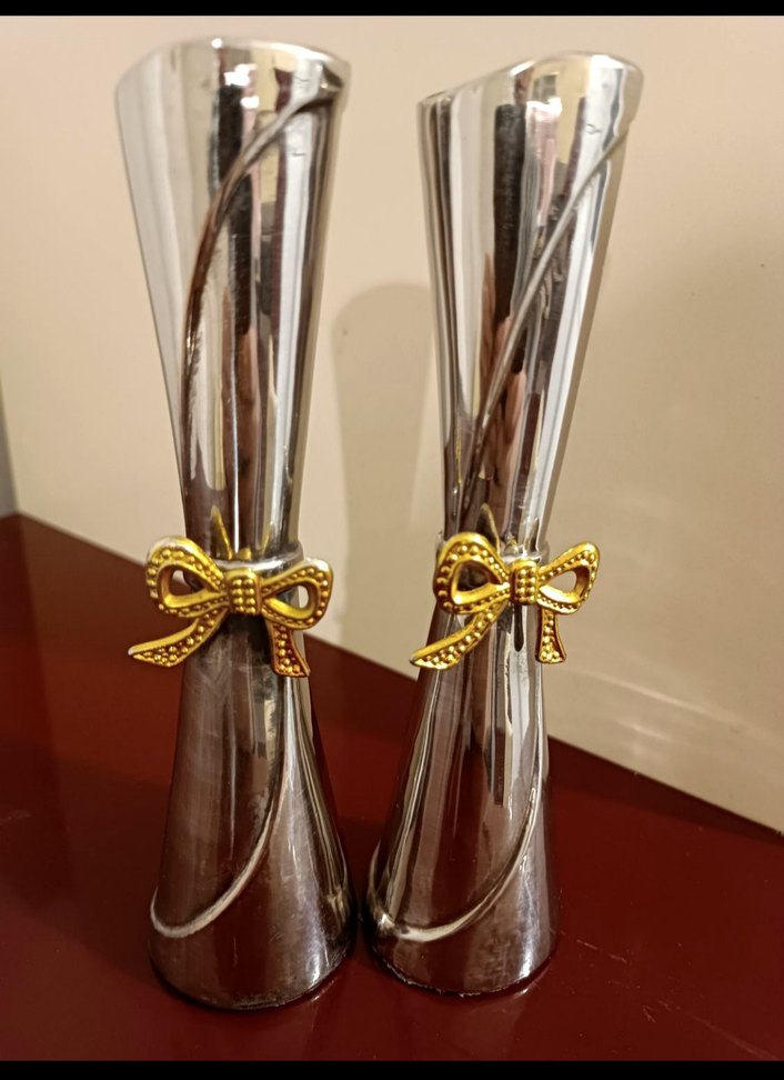 2 adet fiyatıdır. Sadece vitrinde sergilenmiş eski ama tertemiz bir Alman gümüşleridir. Kararması defosu çiziği yoktur. Bu kadar temizi çok nadir bulunur. Kararmış ürünlerle kıyaslamayınız. 17 cm yükseklik olarak fotoğrafta gözükmektedir. Videoda ayrıntılı olarak gözüktüğü gibidir. Parlak altın renkli, şık tasarımlı ve dekoratif fiyonk detaylı vazolar. Her odaya zarafet katar.