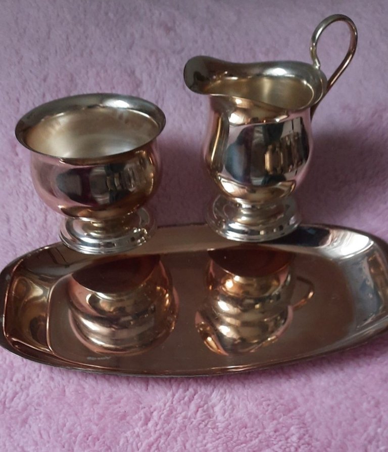 Eskilerden oldugu için hafif bir kararma var. Parlak altın renkli, geleneksel tarzda, desen içermeyen kremalık, şekerlik ve tepsiden oluşan tabak seti. ✨