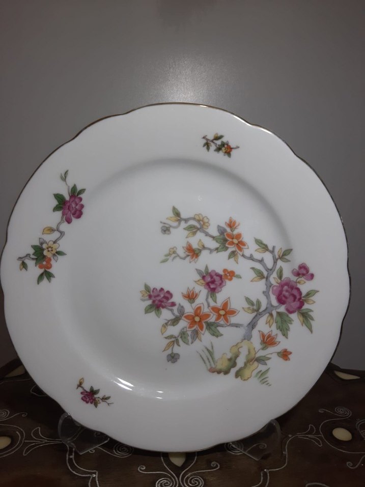 Pastel renklerde çiçek desenli, beyaz tabak. Kenarında hafif altın rengi çizgi ve dalgalı kenar bulunur. ️alman damgalı 4 adet fiyatıdır adet fiyatı sorabilirsiniz.