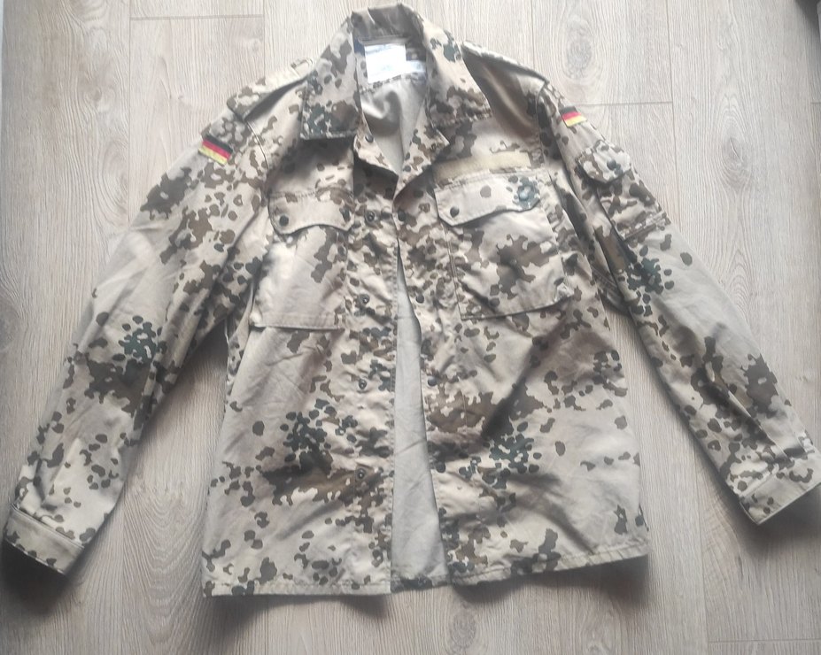 Tropentarn kamuflaj paterninde Alman ordusunun çöl arid / sıcak iklim askeri ceketi / gömleğidir. Bundeshwer ve deniz piyadeleri tarafından kullanılmaktadır. 1 adet kol 2 adet göğüs cebi bulunmaktadır hepsi metal düğmelidir ayrıca omuz kısmında ve bileklerde velcro kısımları yer almakta. Koltuk altlarında terlemeyi azaltmak için mesh yapı bulunmaktadır. Üzerindeki etikette NATO Stok kodu yer almaktadır. Istenirse NATO sorgu sitesinden resimdeki 2. kısımda 12 yazan numarayı girip ürünü ve geçmişini sorgulayanilirsiniz Arid (kurak) bölgeler için geliştirilmiş, hafif ancak yıpranmaya karşı dirençli kumaştır twill dokumadır. Pazarlık vardır