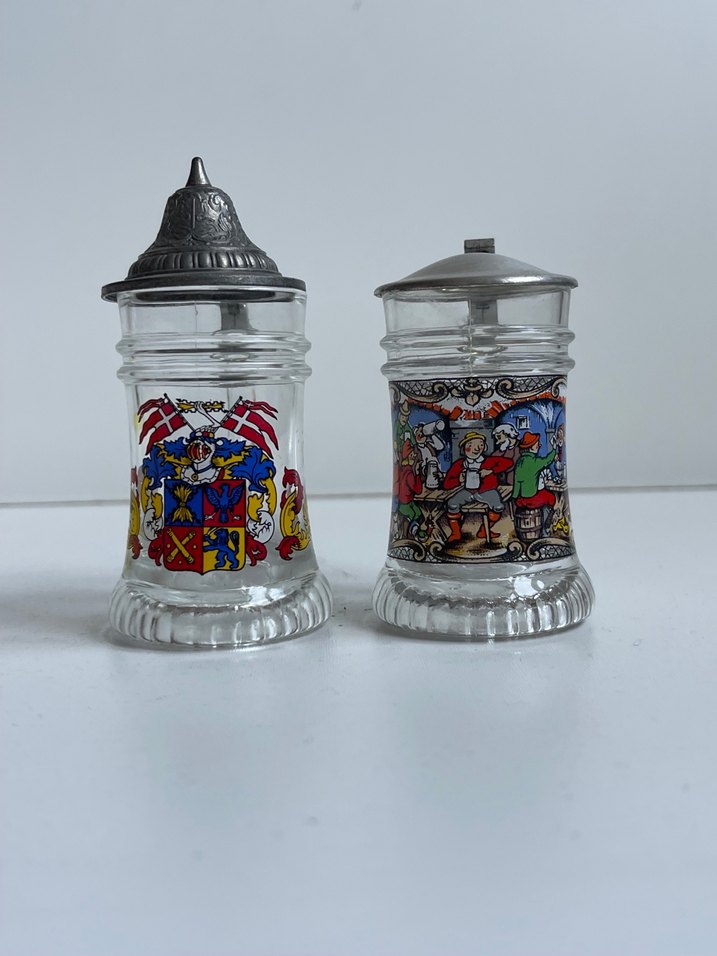 İki adet renkli desenli cam baharatlık, metal kapaklı, üzerinde canlı ve detaylı baskılar bulunur.