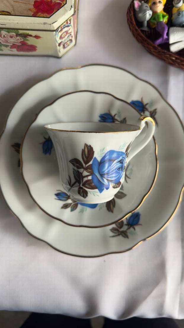 İnce porselenden yapılmış, mavi gül ve gri yaprak desenli, altın detaylı fincan ve tabak ve tatlı tabağı takımı. Ürün 2'li settir. İkili takım fiyatıdır. Toplam 6 parça klasik ve zamansız şık bir ürün.