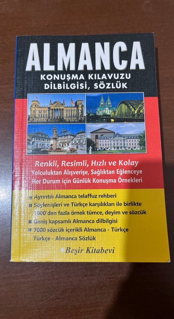 Ayrıntılı Almanca telaffuz rehberi, 7000'den fazla Almanca-Türkçe kelime, günlük konuşma örnekleri ve renkli resimlerle dolu kapsamlı bir dilbilgisi ve sözlük kitabı.