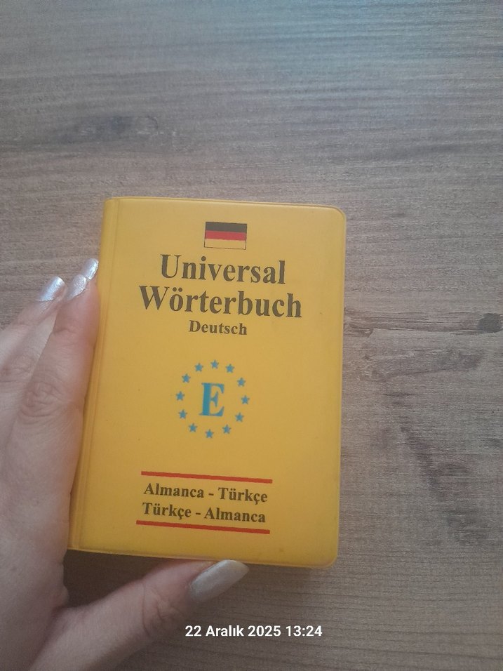 Almanca-Türkçe ve Türkçe-Almanca çeviriler için kullanışlı, küçük evrensel sözlük, sarı kapaklı.