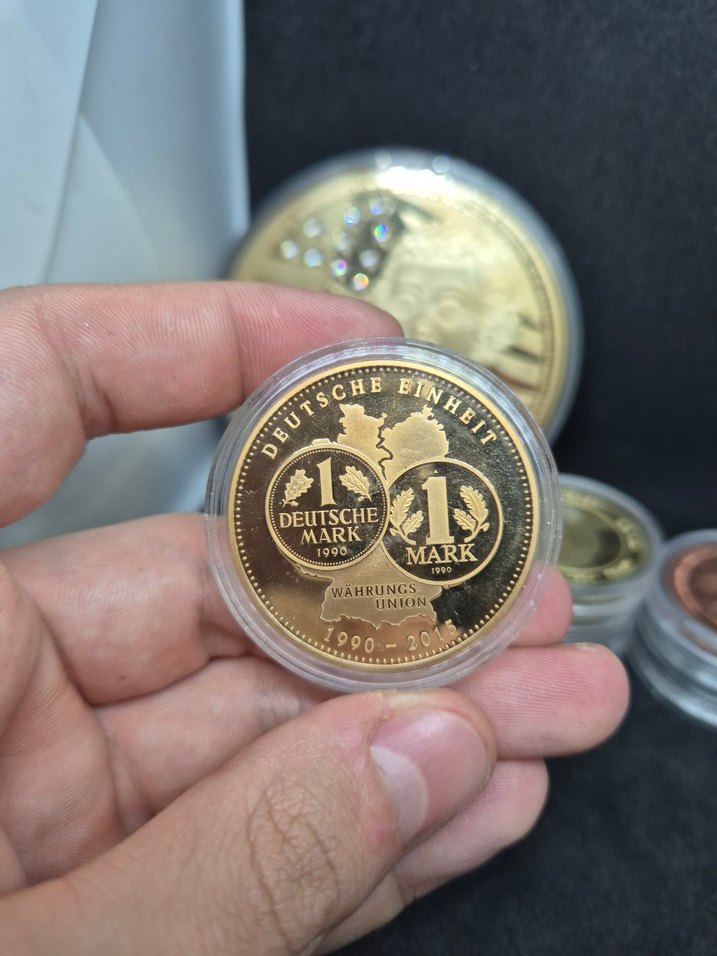 Parlak altın renkli bu erkek rozeti, vintage karşı kültür tarzı ve 'MARK, DEUTSCHE, 1, MARI' yazılarıyla eski bir görünüme sahip. ✨