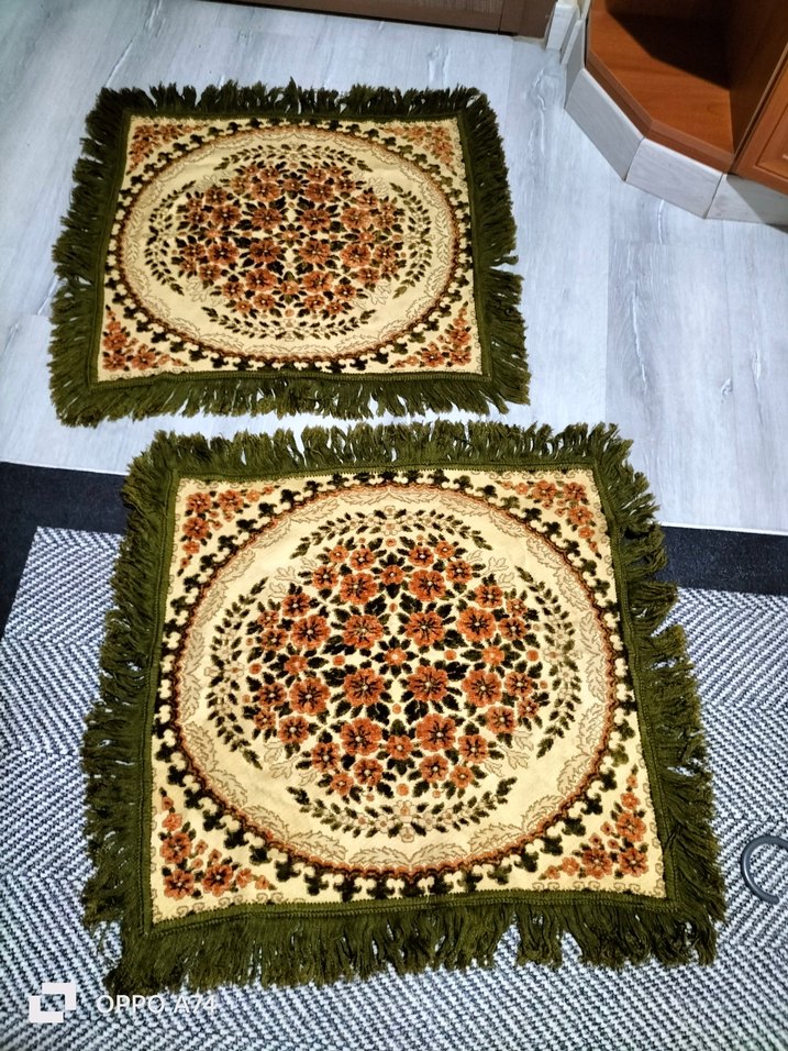 çok renkli çiçek desenlerine sahip, yeşil püsküllü iki adet geleneksel vitange tarzda örtü seti. iyi durumda. yırtık sökük aşınma yoktur kesinlikle . adet fiyatıdır .