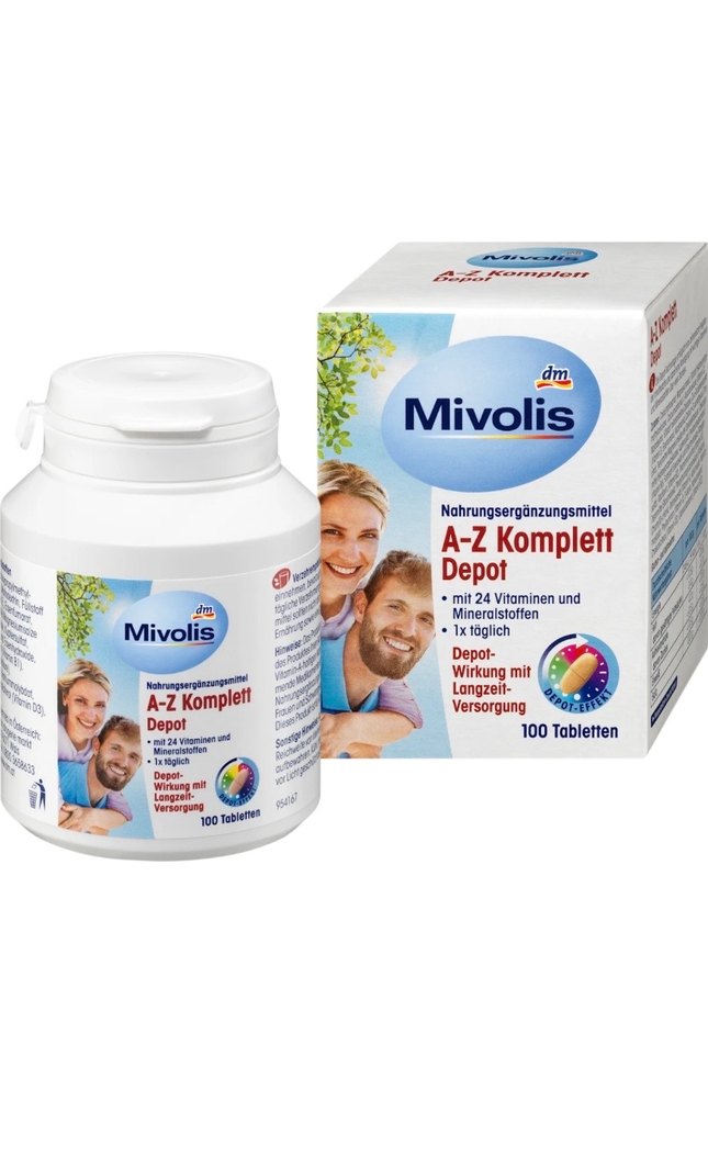 Mivolis A-Z Komplett Depot, 24 vitamin ve mineral içeren 100 tablet ile uzun süreli destek sağlar. Orjinaldir.A dan Z ye tüm vitaminleri içerir.Kutu içerisinde 85-90 adet arası vardır. #almanyadan #yurtdışından #orjinal #dm #mivolis #spor #sporcu #kramp #kas #ithal #takviye #hediyelik #balea #abtei #tetesept #doppel #isana #osteo