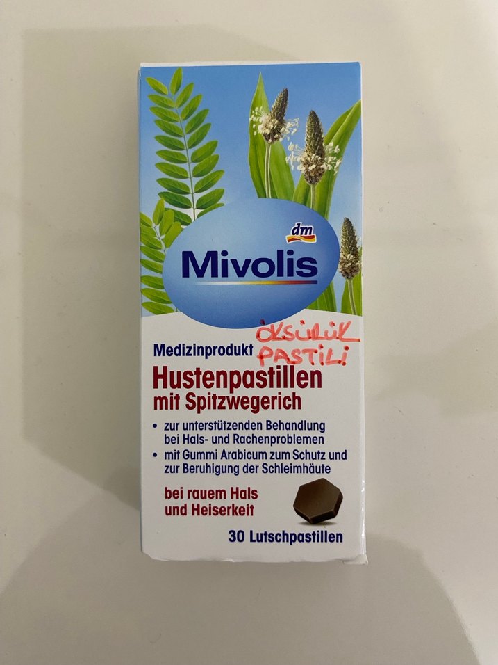 Orjinaldir.İçerisinde 30 adet bulunmaktadır yalnız 4 tanesi kullanıldı 26 adet var.Mivolis boğaz pastili, boğaz ve yutak problemleri için bitkisel destek sağlar. Mukozayı koruyan ve yatıştıran sakız arabikumu içerir. ürün açıklamaları görsellerde mevcuttur. #almanyadan #yurtdışından #ithal #mivolis #orjinal #dm