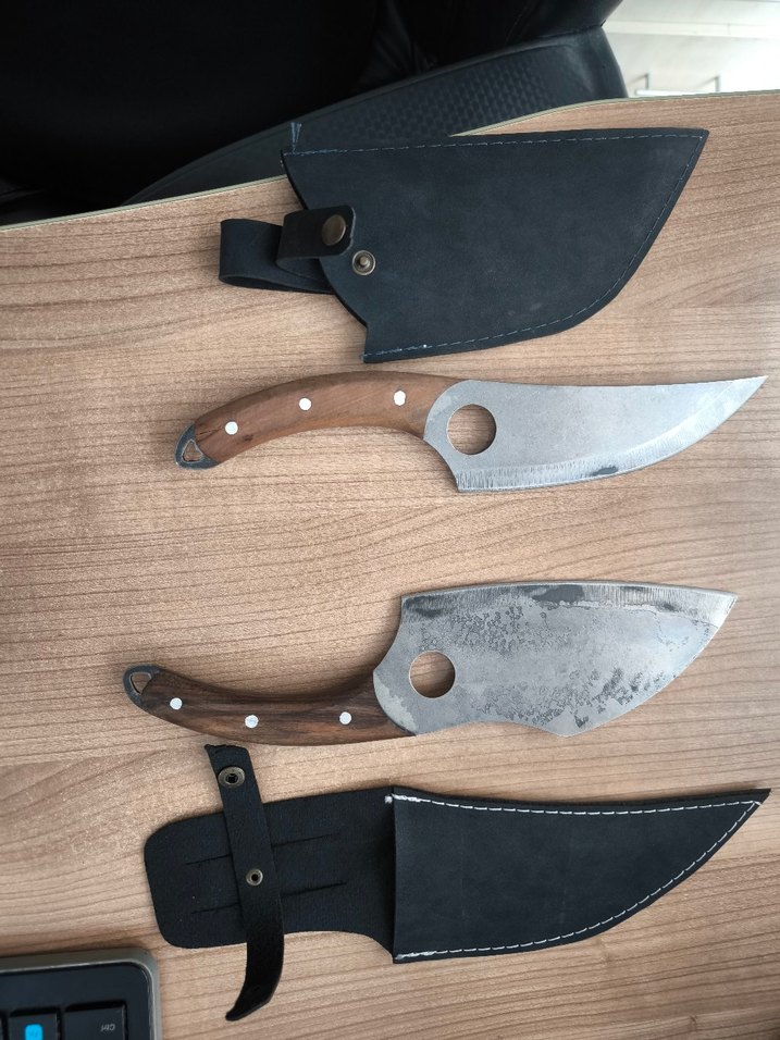 Ahşap saplı ve paslanmaz çelik bıçaklardan oluşan set, koyu renk kılıflarla güvenli saklama sağlar.