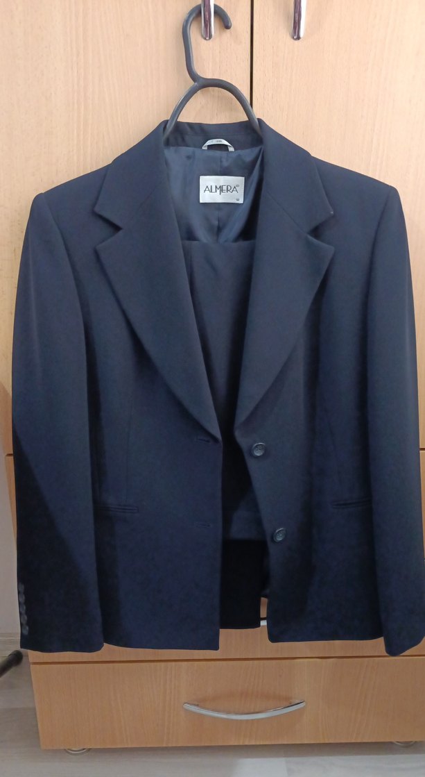 ALMERA markalı, düğmeli detaylı, normal boy lacivert kadın ofis takımı. İpek gibi kumaştan, klasik ve şık görünüme sahiptir. kumaşı kaliteli astarı var. pazarlık payı vardır.