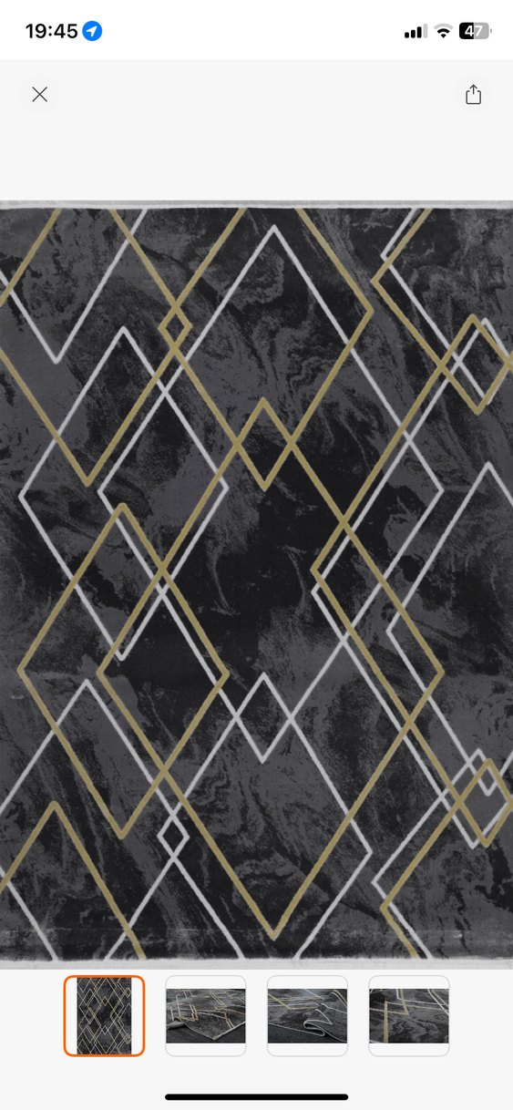 halı, koyu gri tonlarda soyut desen ve altın ile beyaz geometrik çizgiler içerir, mekâna derinlik katar. 3 4 ay serildi sadece çok kaliteli yeni markası yazıyor oturma odasına rengi uymadığı için satmak istiyorum 160/230 cm