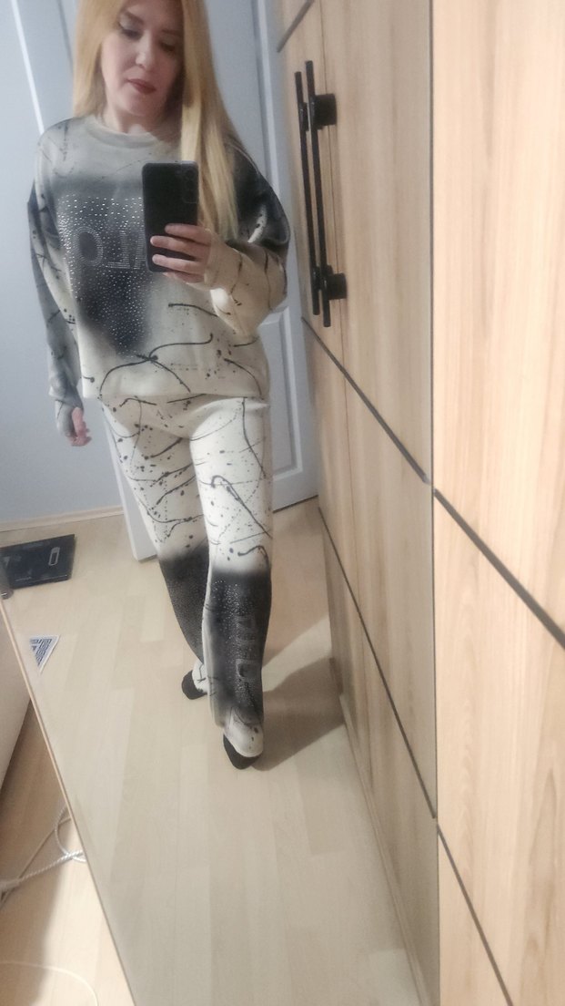 Gri bağlama deseni ve tüy detaylı, uzun kollu, yüksek yakalı, bol kesim kadın eşofman takımı. Sentetik kumaştan, günlük kullanım için uygundur. ♀️