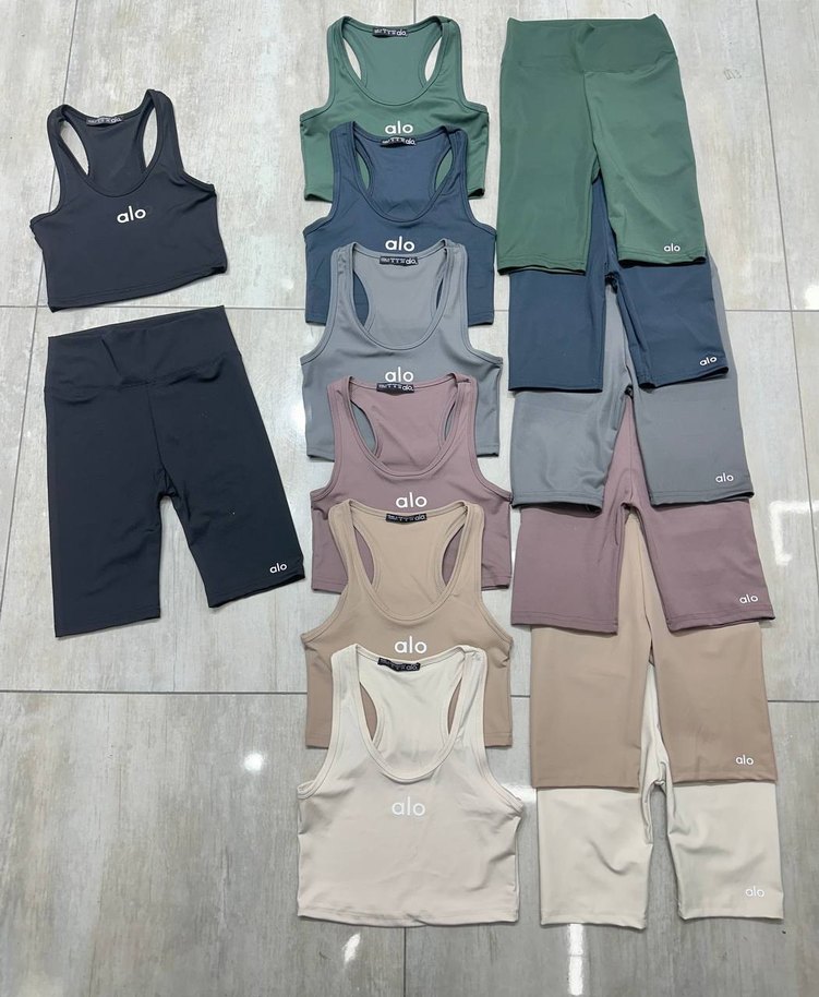 Alo kadınlar için tasarlanmış, düz renkli, sentetik kumaştan mini atlet ve şort takımıdır. Spor ve günlük kullanım için şık ve rahat bir görünüme sahiptir. ♀️