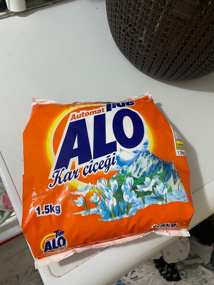 1.5kg ağırlığında, otomatik makineler için uygun ALO Kar Çiçeği toz deterjan. Hafif çiçeksi kokuya sahip, turuncu ambalajda.