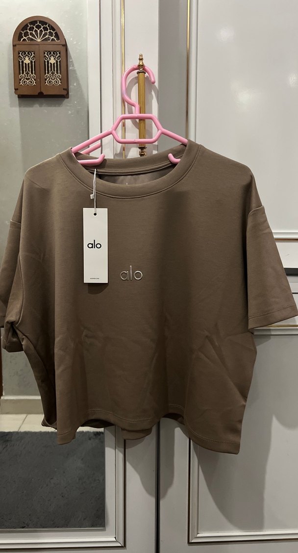 Alo marka, bej renkli, kısa kollu, oversize kesim pamuklu tişört ve eşofman takımdır S/M/L/XL