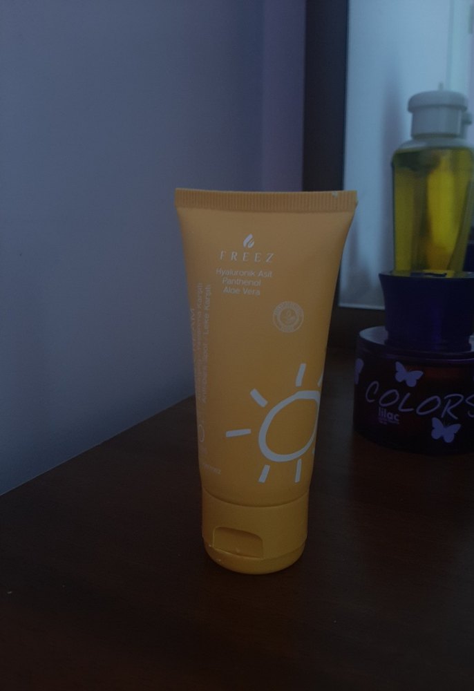 Aloe vera içeren bu güneş koruyucu krem, cildi güneş ışınlarından korur. Sarı renkte, üzerinde güneş simgesi bulunan tüpte sunulur. ☀️