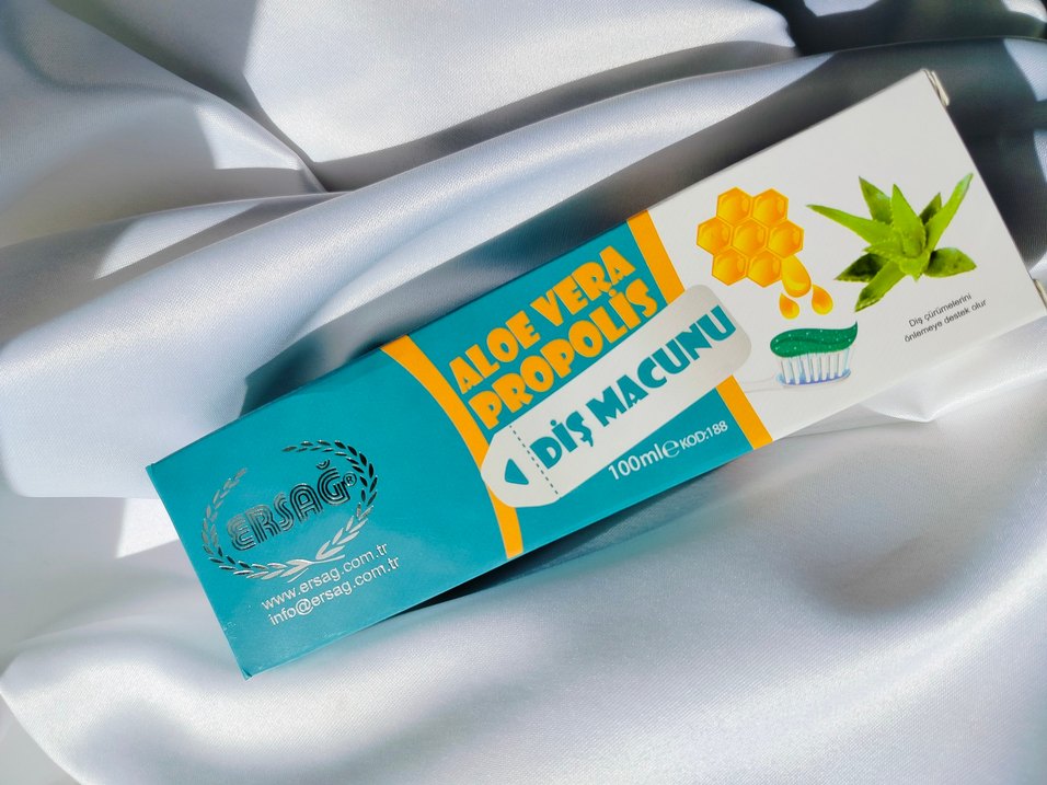 Aloe vera ve propolis içeren, doğal bakım sunan 100ml diş macunu.