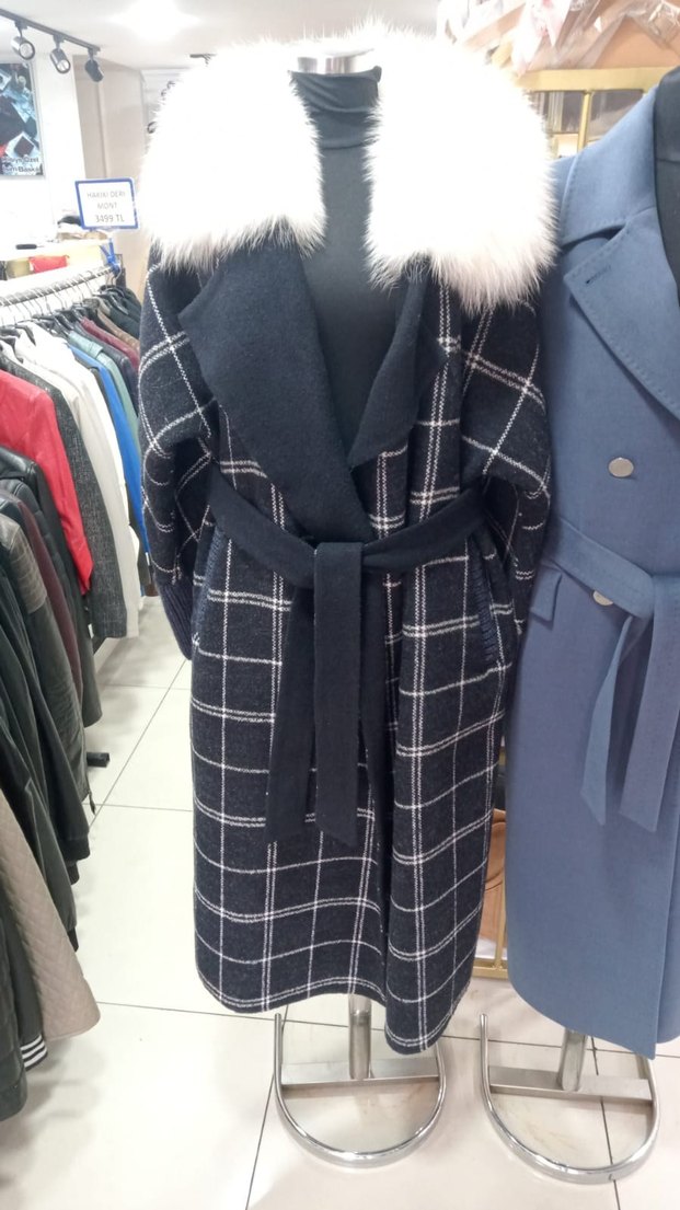 Gri kare desenli, uzun, sentetik kumaştan yapılmış kaban. Kürklü yakası, kemerli beli ve strappy kollu, rahat kesim. Sokak modasına uygun, günlük kullanım için ideal.