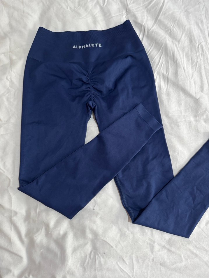 Alphalete markalı, lacivert renkli, elastik kumaştan yapılmış sıkı kesim spor tayt. Arkada büzgü detayı bulunur, spor ve günlük kullanım için uygundur. ️♀️
