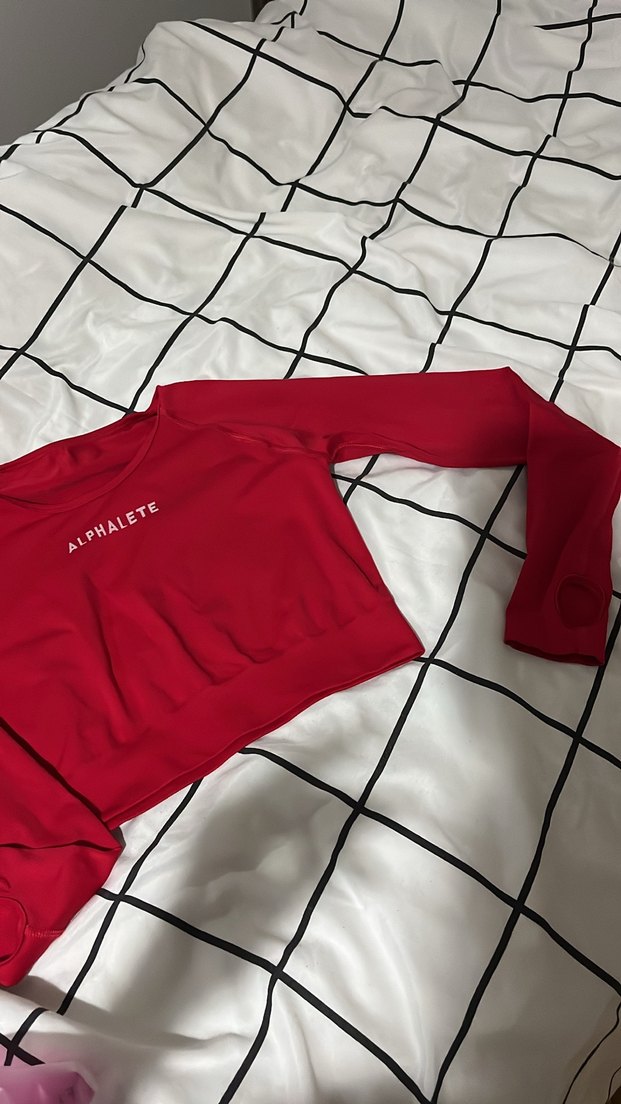 Kırmızı, uzun kollu tek renk spor üst. Tekne yaka ve ALPHALETE logosu bulunur. Şehir stili ve spor için uygundur. ♀️