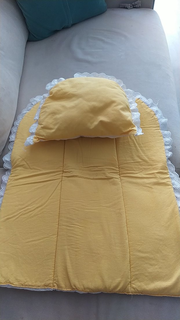 Diger markasına ait, pastel sarı renkte, beyaz dantel kenarlı yumuşak bebek uyku seti. alt açma minderi yastığı sayılı kullanılmıştır