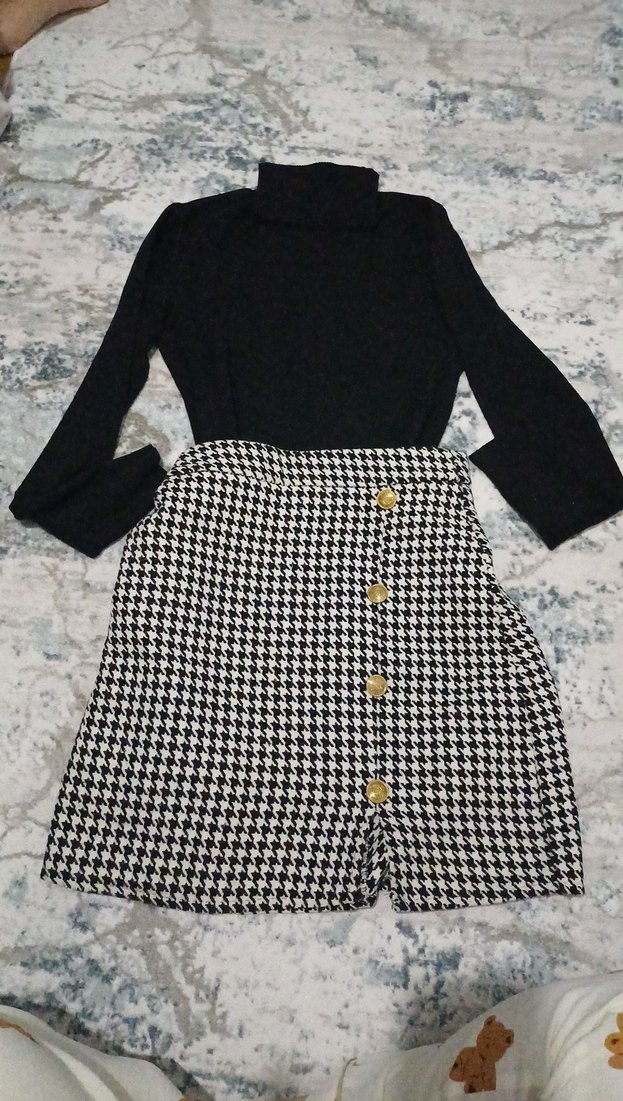 Düğmeli, siyah beyaz kareli desenli, sentetik kumaştan yapılmış, vücuda oturan mini etek. Günlük kullanım için uygun, Paris tarzı sokak modası. alt üst ikisini bir satiyorum çok iyi fiyat etek dilvin etek 34 beden bogazli bluz standart