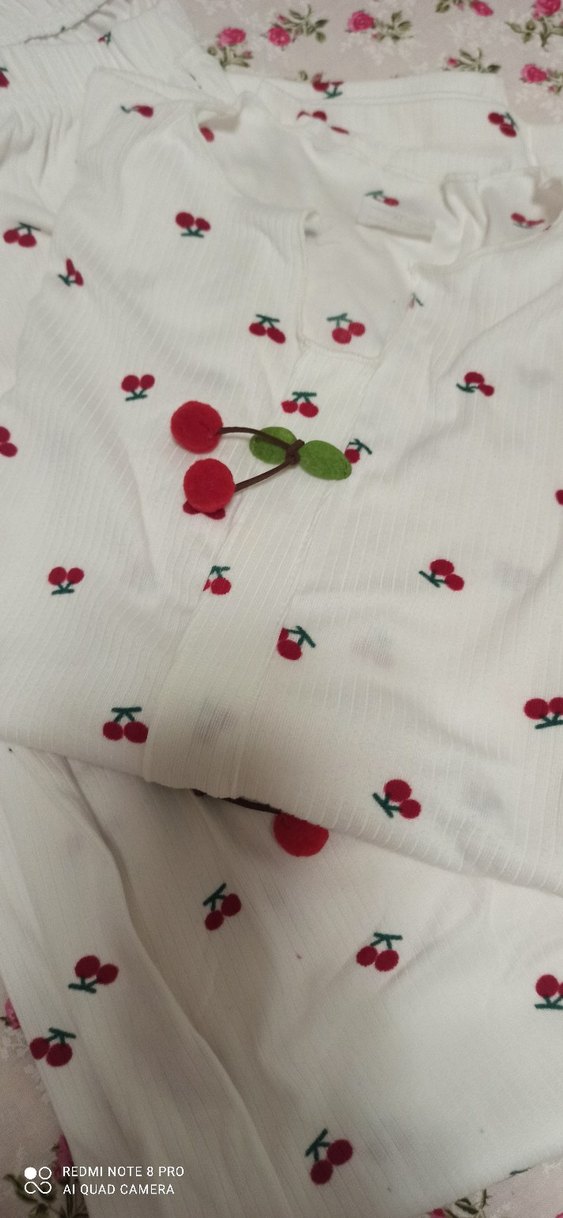 Nakış işlemeli kiraz desenli beyaz hemşire önlüğü, dar kesim midi boy, uzun kollu ve V yakalı. Pastel renkler yumuşak bir dokunuş sağlar.