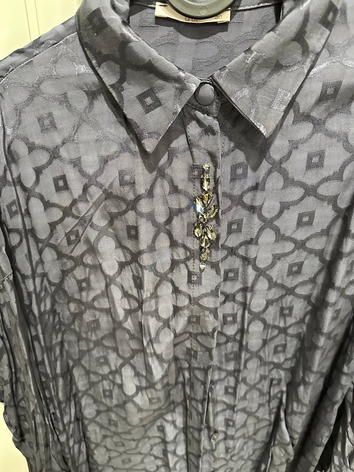 Kendinden desenli,uzun kesim kadın gömlek. Sadece yıkandı giyilmedi. Gömlek boy omuzdan aşağıya 65 cm. Arkası 3-4cm uzun