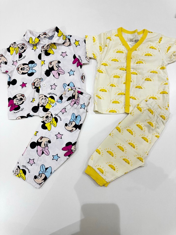Minnie Mouse baskılı, diğeri sarı güneş desenli iki renkli çocuk pijama seti. Sayılı giyilmiştir.