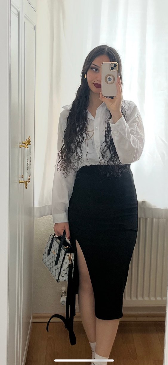 Beyaz, v yaka ve uzun kollu, düz desensiz, sentetik kumaştan yapılmış, ofise uygun şık ve rahat bir gömlek. ✨
