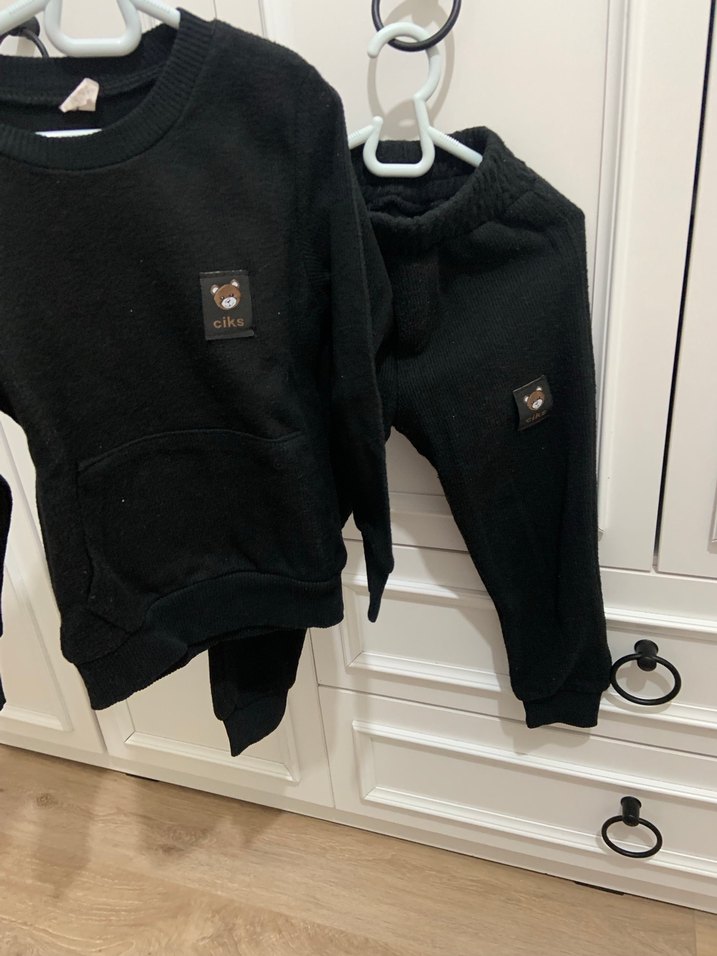 Siyah, uzun kollu, bisiklet yaka sweatshirt ve kadife yumuşak kumaş pantolon. Markası yok butikten almıştım