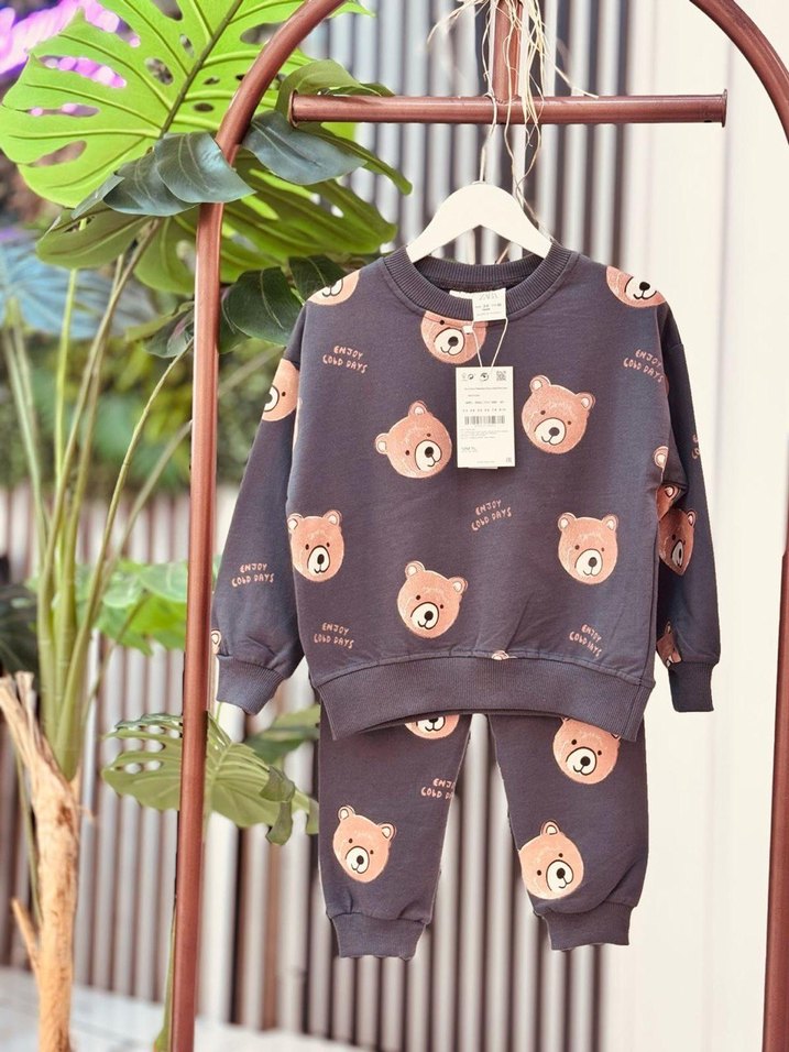 Uzun kollu, bisiklet yaka üst ve ayı baskılı pantolonlu takım. Yumuşak, sıcak örme kumaştan, kahverengi ve gri tonlarda rahat ve şık. baharlık iki iplik kreşlik ürün 7/8 yaş