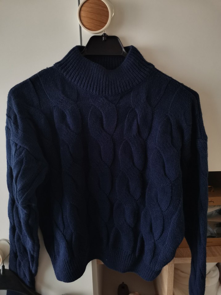 Lacivert renkli, boğazlı ve uzun kollu örgü kazak ve etek. Rahat kesimi ve sade tasarımıyla günlük kullanıma uygundur.