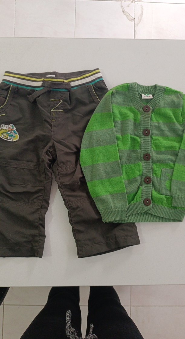 Nakışlı, uzun kollu, yeşil çizgili triko hırka ile çizgili bele sahip koyu yeşil renk içi penye astarlı pantolondan oluşan bebek erkek takımı.