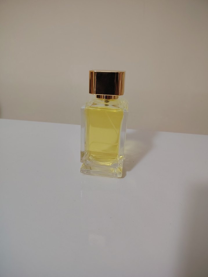 Altın kapaklı, şeffaf cam şişede sarı renkli erkek parfümü. %40 esans oranı