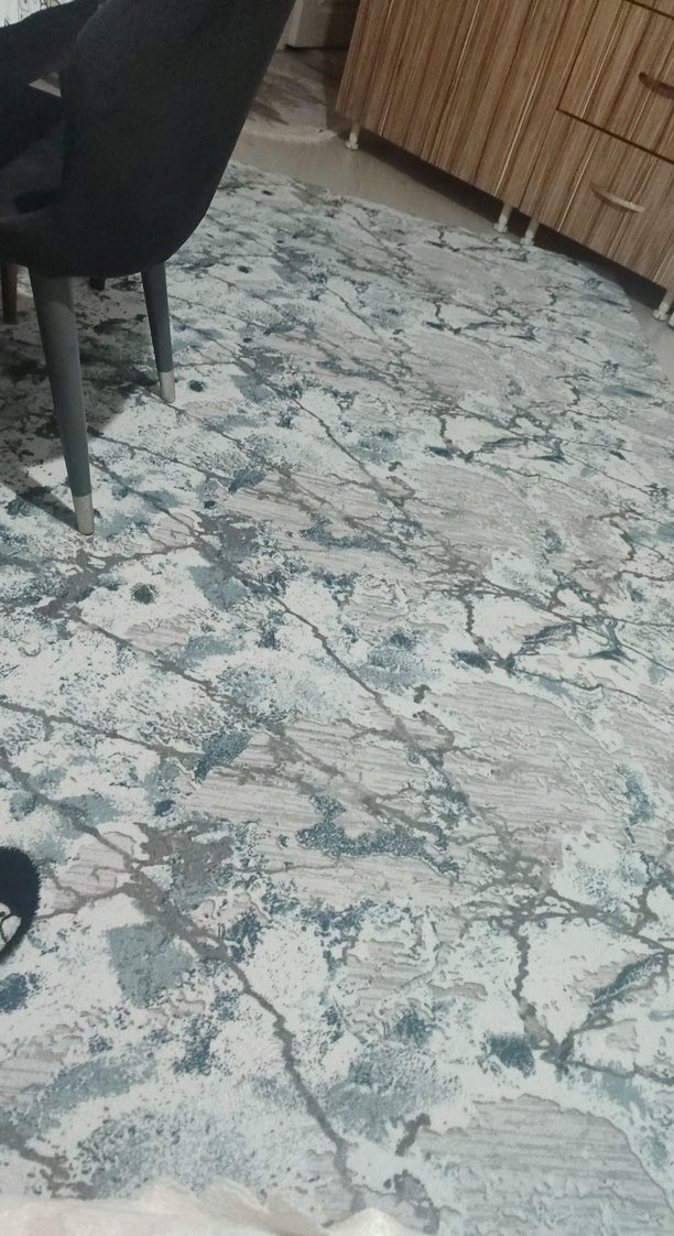 Petrol beyaz bej tonlarda soyut desenli çağdaş halı, örtüsü modern dokunuş katar. Yumuşak dokusu farklı iç mekanlara uyum sağlar. yeni gibi hiç deformesi yok 1 adet