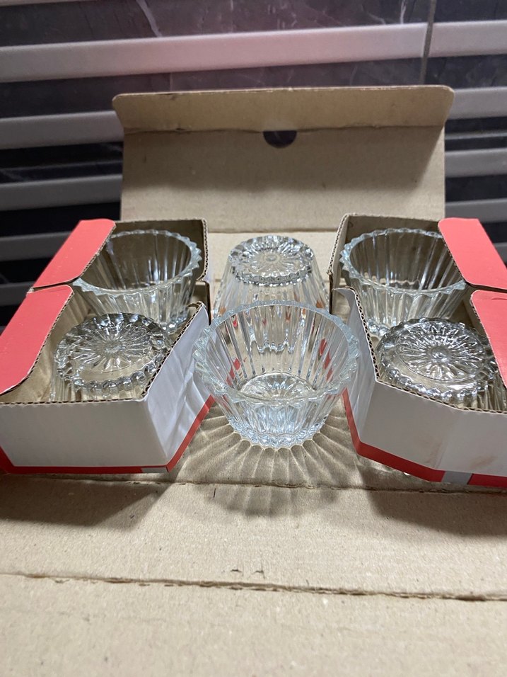 Altı adet dokulu cam kase, kırmızı beyaz kutuda paketlenmiş. Küçük porsiyonlar için uygundur. ️
