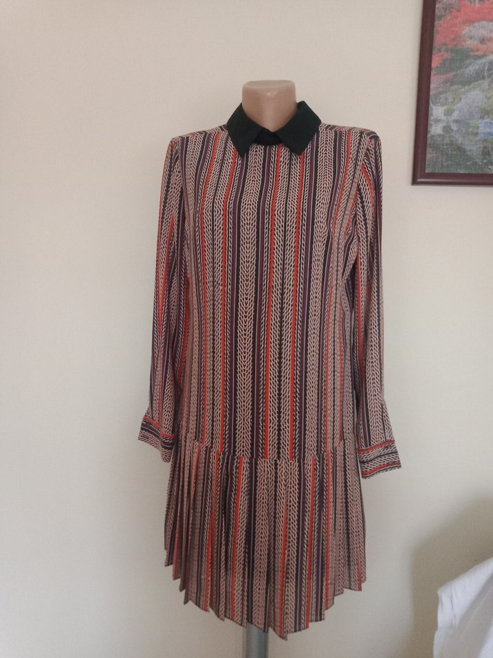 N...Bohem tarzda, yakalı ve uzun kollu. Gri ve çok renkli çizgili, pilili tasarıma sahip, ofis kullanımı için uygun. tül altı astar kollarında astar yok ama cok iç göstermez.sayılı kullanıldı.xs yazıyor ama 40 bedene kadar olur.