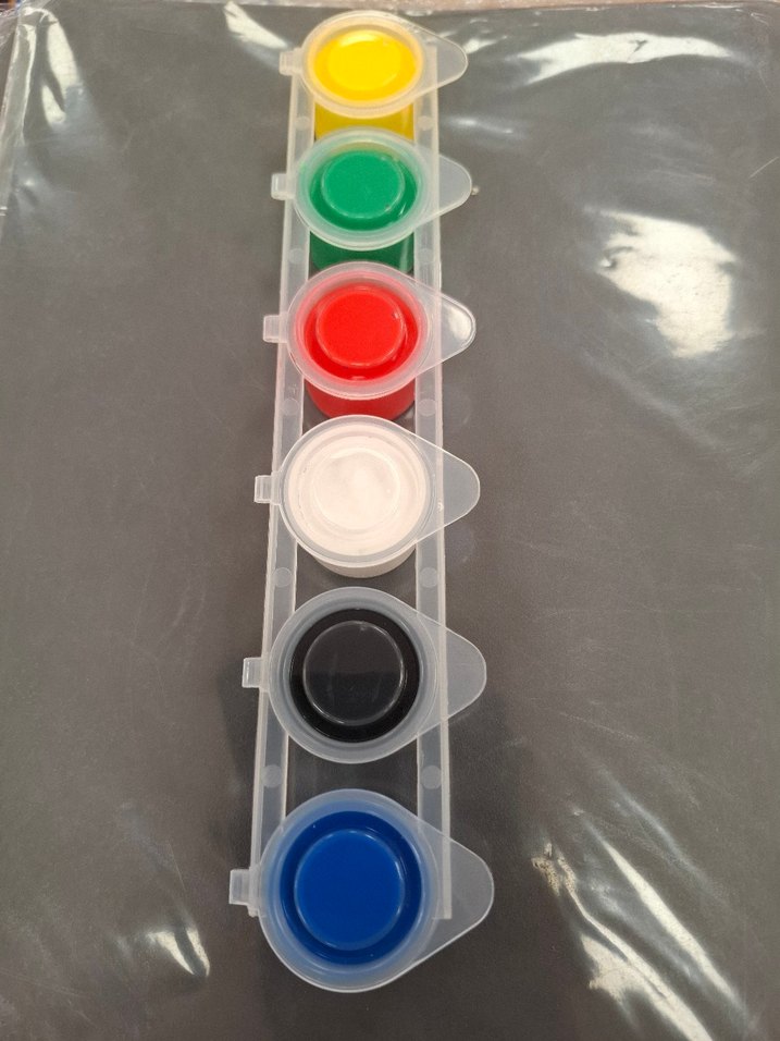 Altı farklı koyu canlı renkten oluşan küçük kaplarda sulu boya seti. 6 ml boya