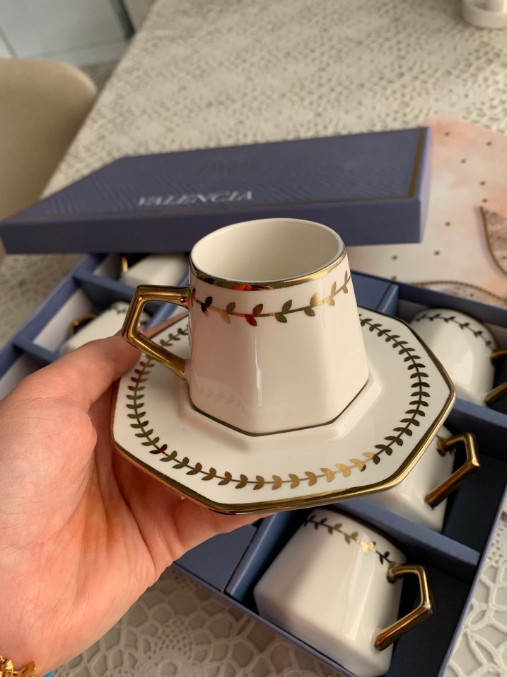 Paçi marka Altıgen beyaz porselen fincanlar, altın renginde kulplar ve yaprak desenli kenar süslemeleriyle birlikte servis tabağı içerir. Şık bir sunum için idealdir. ☕ Hiç kullanılmadı hediye geldi İndirim uygulanır