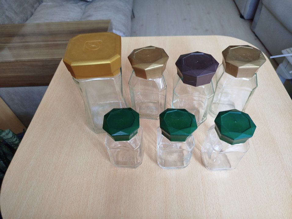 Koyu bej, kahverengi ve yeşil kapaklı altıgen cam kavanoz seti, baharat veya küçük eşyalar için uygundur.