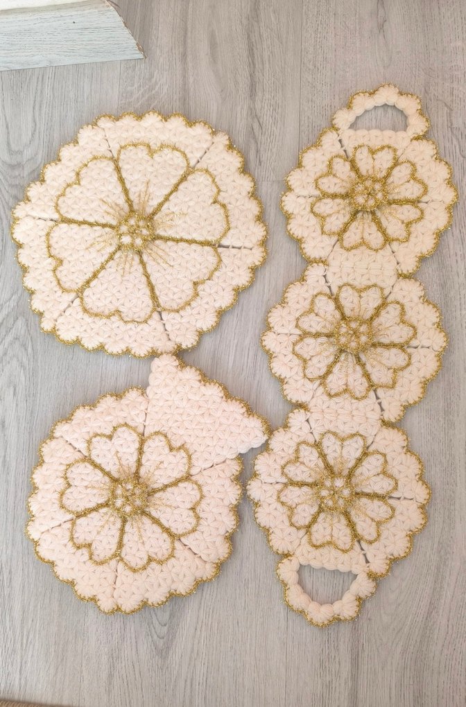 Beyaz ve altın tonlarında çiçek ve altıgen desenli el örgüsü set. Gelin lif seti öğrenciyim kitap paramı çıkarmak için yapıyorum satıyorum destek olabilir misiniz? hemen kargoya veririm.