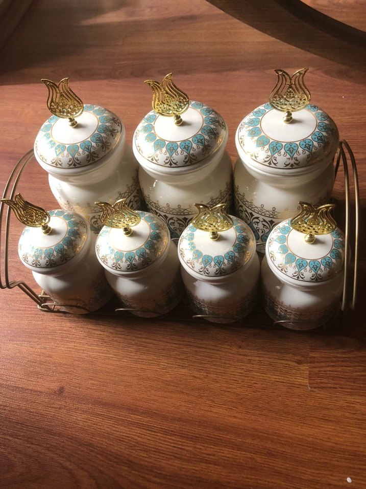 Altılı beyaz baharatlık seti, turkuaz desenli ve altın renkli lale şeklinde kapaklara sahip, tepsi üzerinde düzenlenmiş.