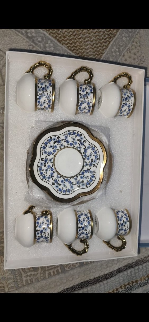 Altı adet beyaz porselen kahve fincanı, mavi çiçek desenli ve altın renkli kulplu, uyumlu bir tabak ile birlikte.