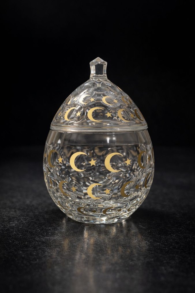 Kapaklı, koyu altın ay ve yıldız desenli şeffaf cam şekerlik .Yuvarlak formda ve kapağında çokgen tutma yeri bulunur. Hiç kullanmadım . Sitesindeki satış fiyatı:12.950 tl.Üzerindeki desenler altın suyuna el işçiliğidir.