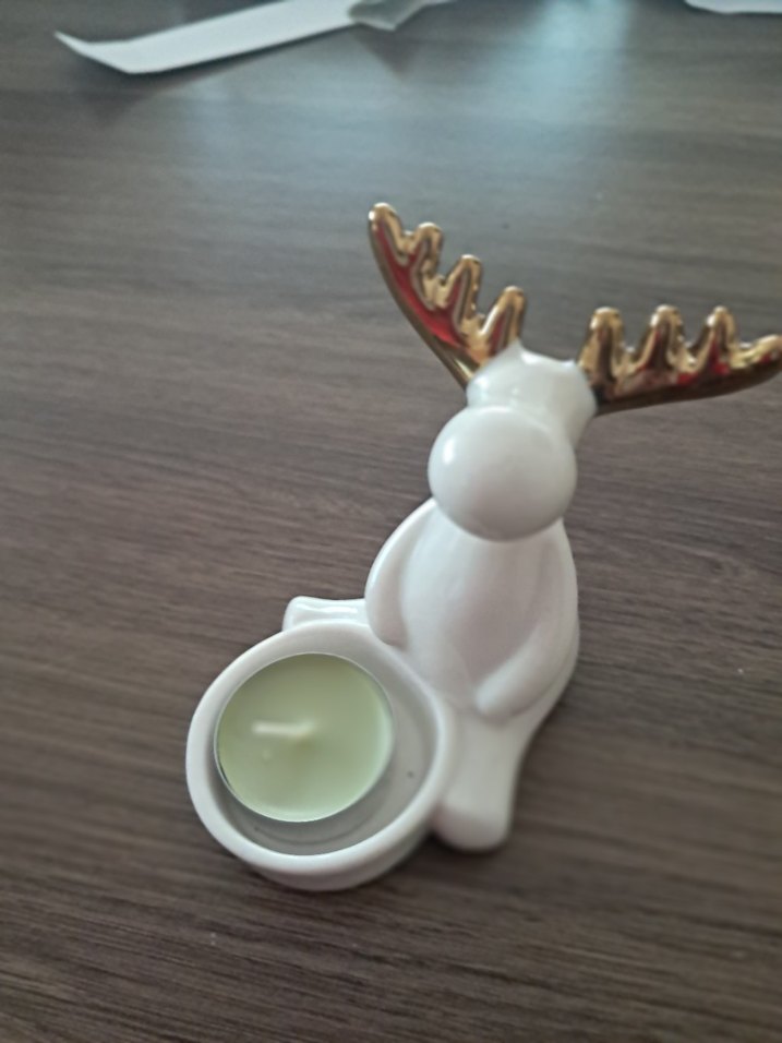 Altın boynuzlu beyaz geyik şeklinde küçük mumluk, dekoratif bir dokunuş sağlar. ️